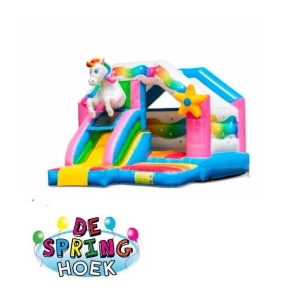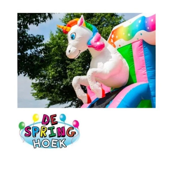 Stap in de roze glitter wereld van de eenhoorn. Dit is de vrolijkste en kleurrijkste springkussen die er te vinden is. Buiten boven de ingang staat de gigantische eenhoorn je al op te wachten om samen op avontuur te gaan. Spring rond in de fantasiewereld of glij onder de buik van de eenhoorn weer naar buiten de echte wereld in.
